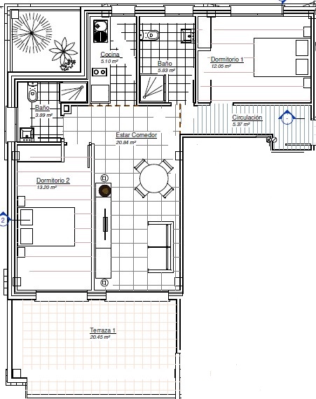 Apartamento compuesto de dos dormitorios, dos baños, cocina, salón-comedor y terraza con vistas. Situado en la planta primera del edificio.